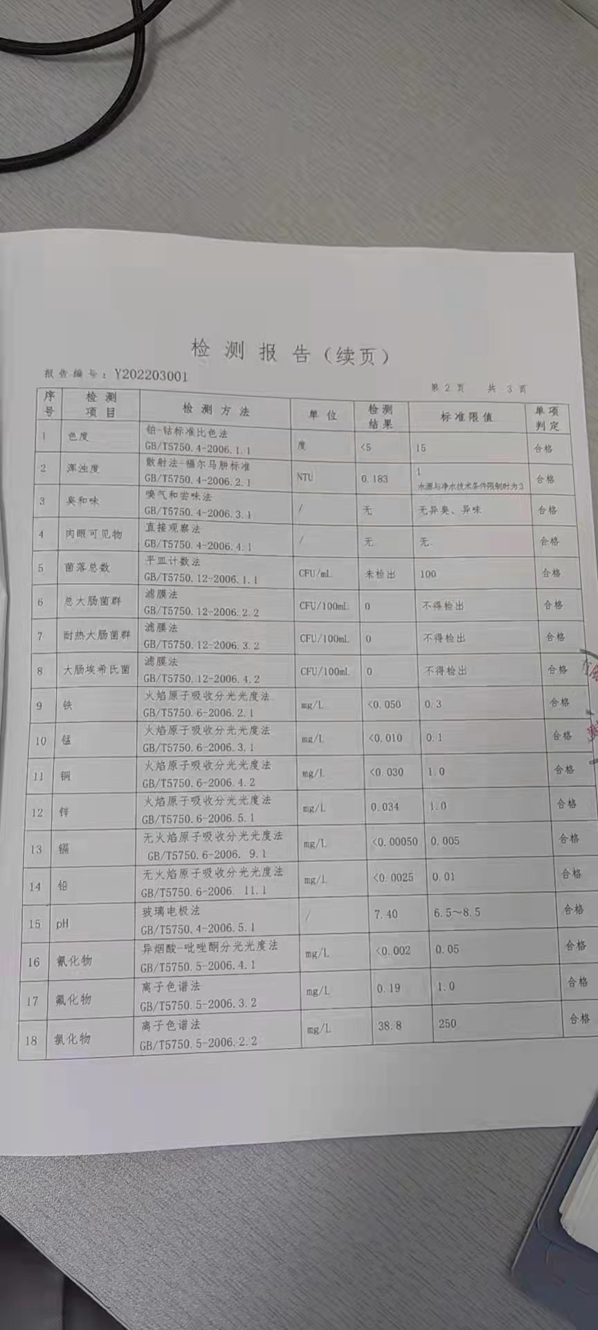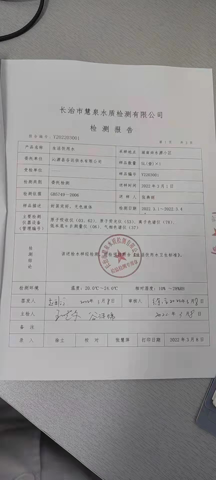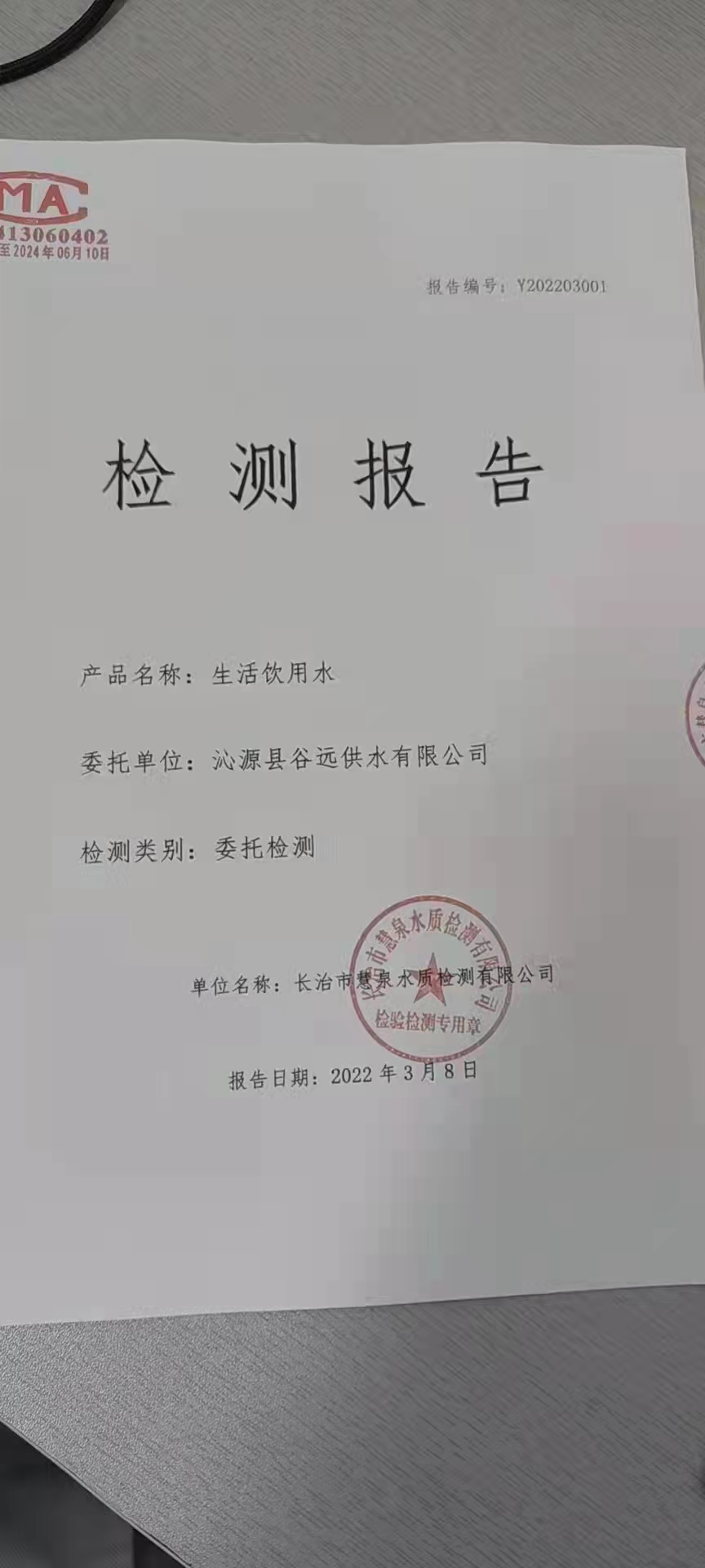 | 标题:沁源县谷远供水有限公司2022年第一季度水质检测报告 | |