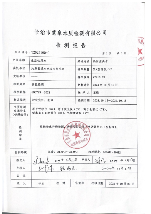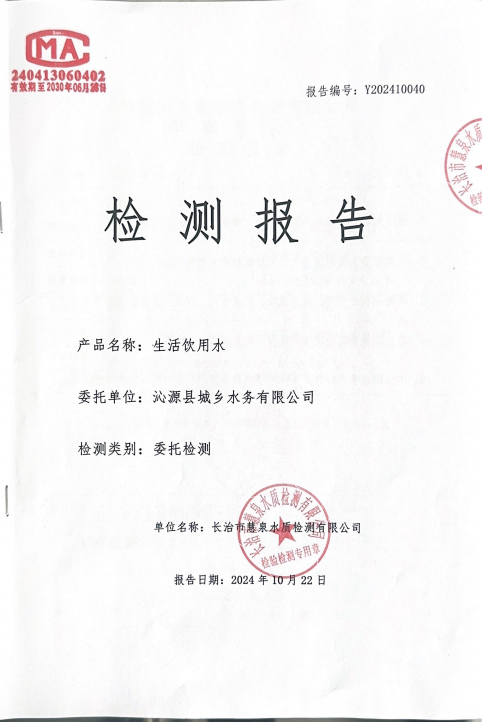 该检验报告由长治市慧泉水质检测有限公司对沁源县城乡水务有限公司供水水质监督检验。