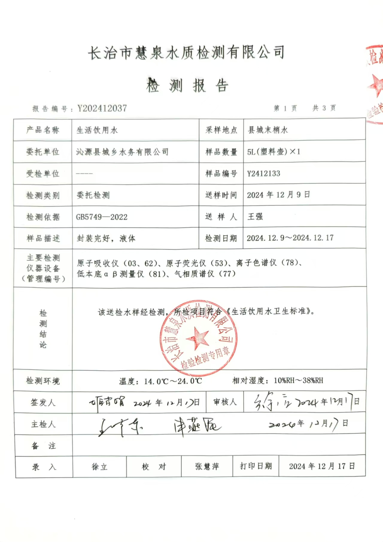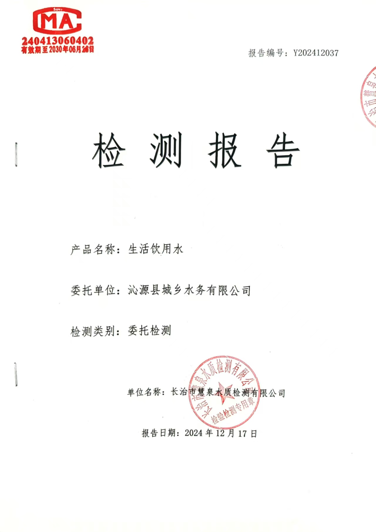 | 标题:沁源县城乡水务有限公司2024年第四季度水质检测报告 | |