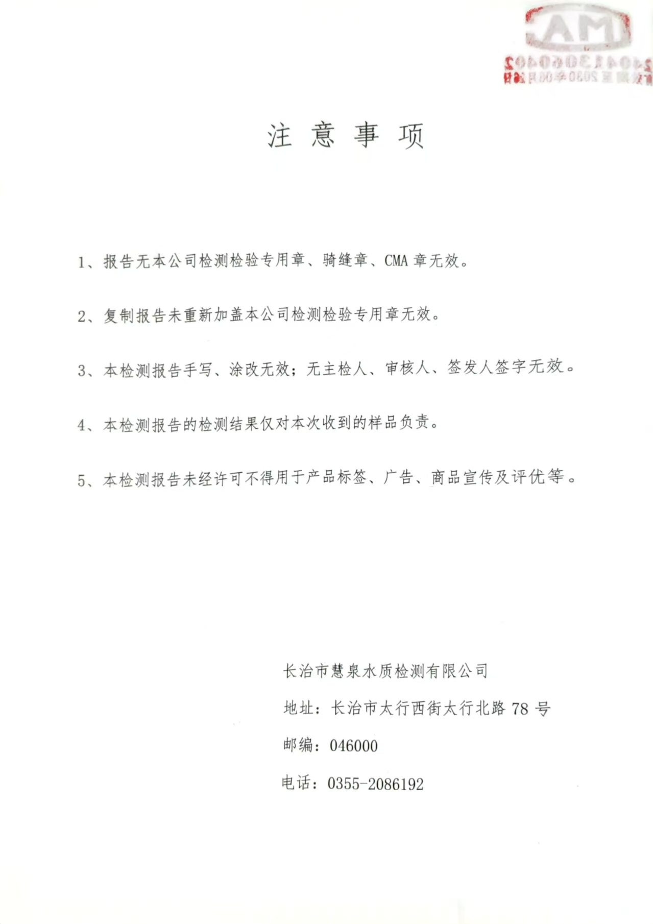 该检验报告由长治市慧泉水质检测有限公司对沁源县城乡水务有限公司供水水质监督检验。