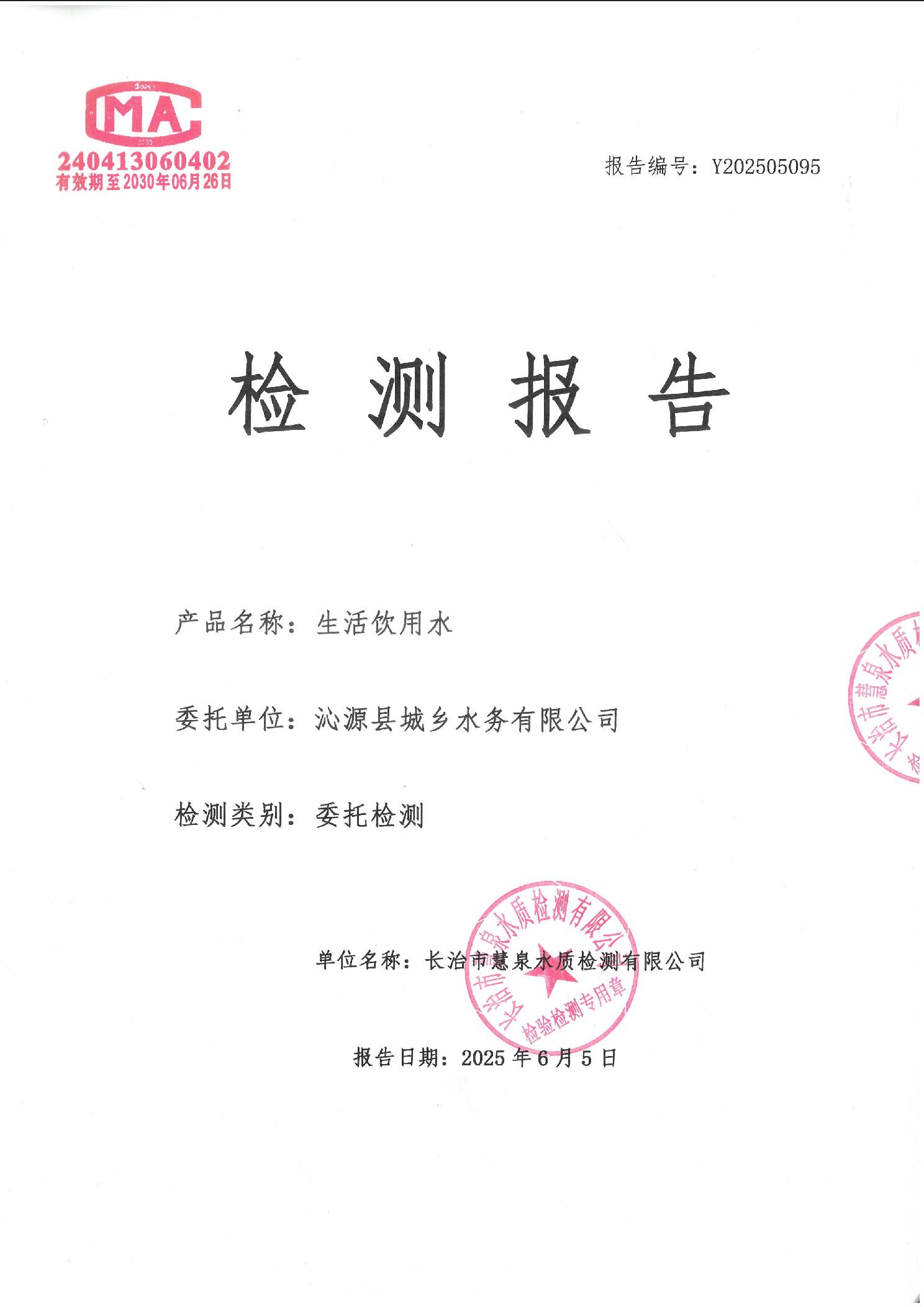 | 标题:沁源县城乡水务有限公司2025年第二季度水质检测报告 | |
