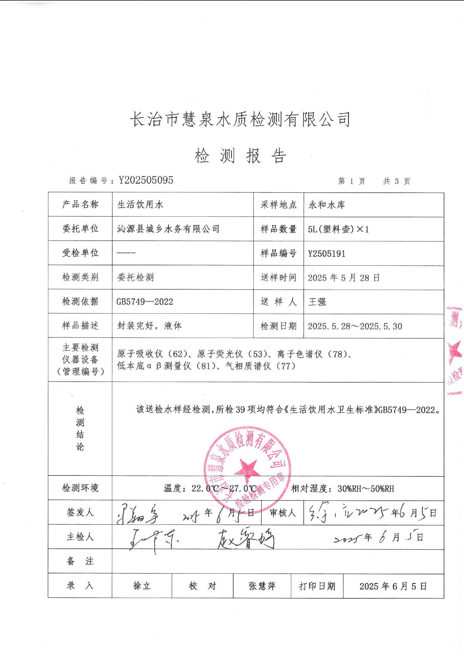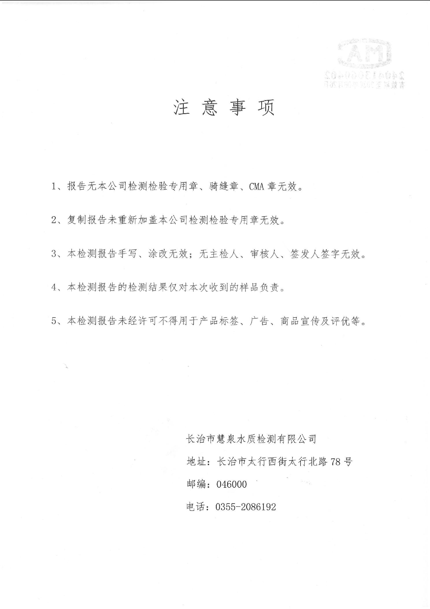 该检验报告由长治市慧泉水质检测有限公司对沁源县城乡水务有限公司供水水质监督检验。