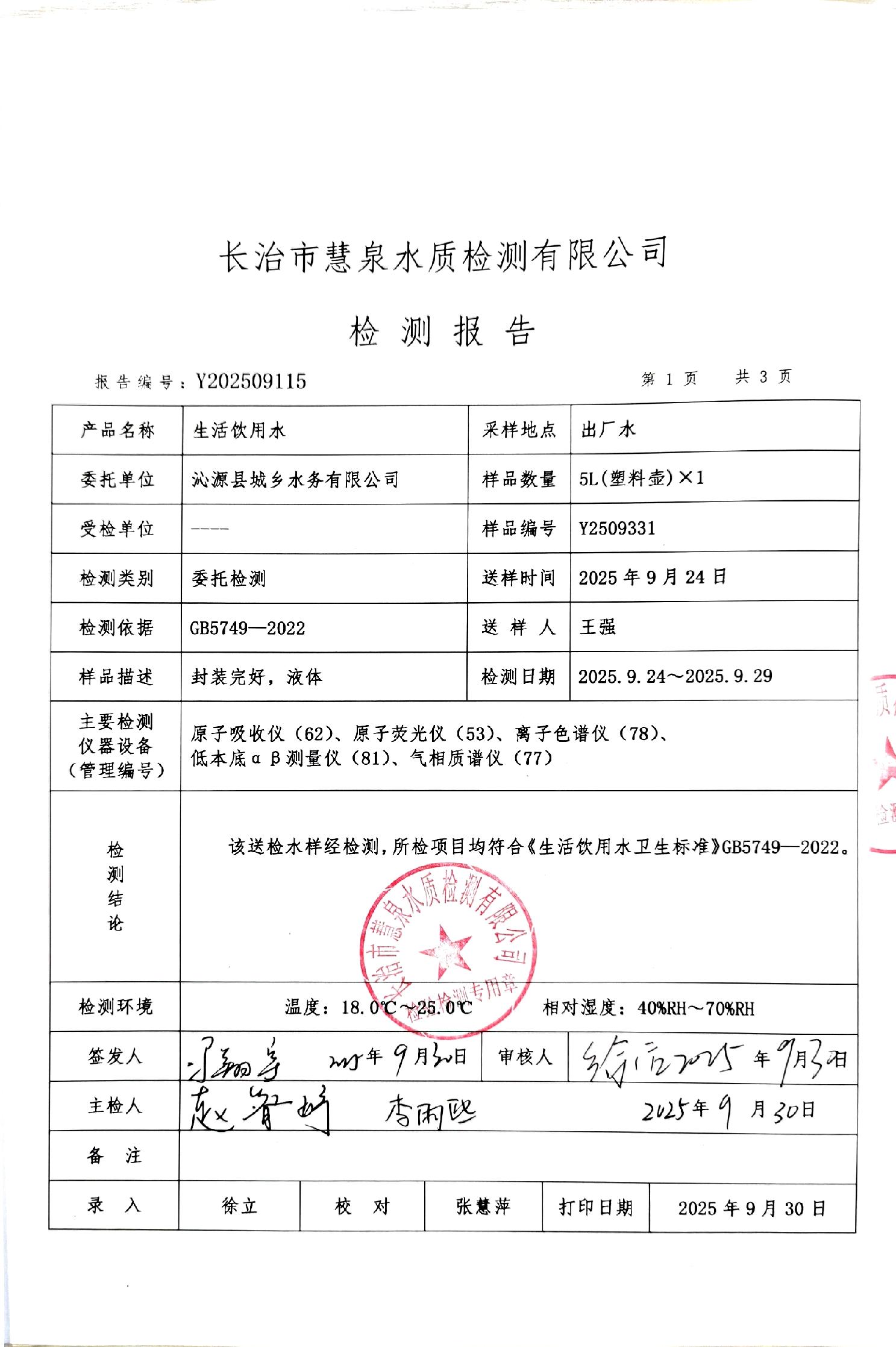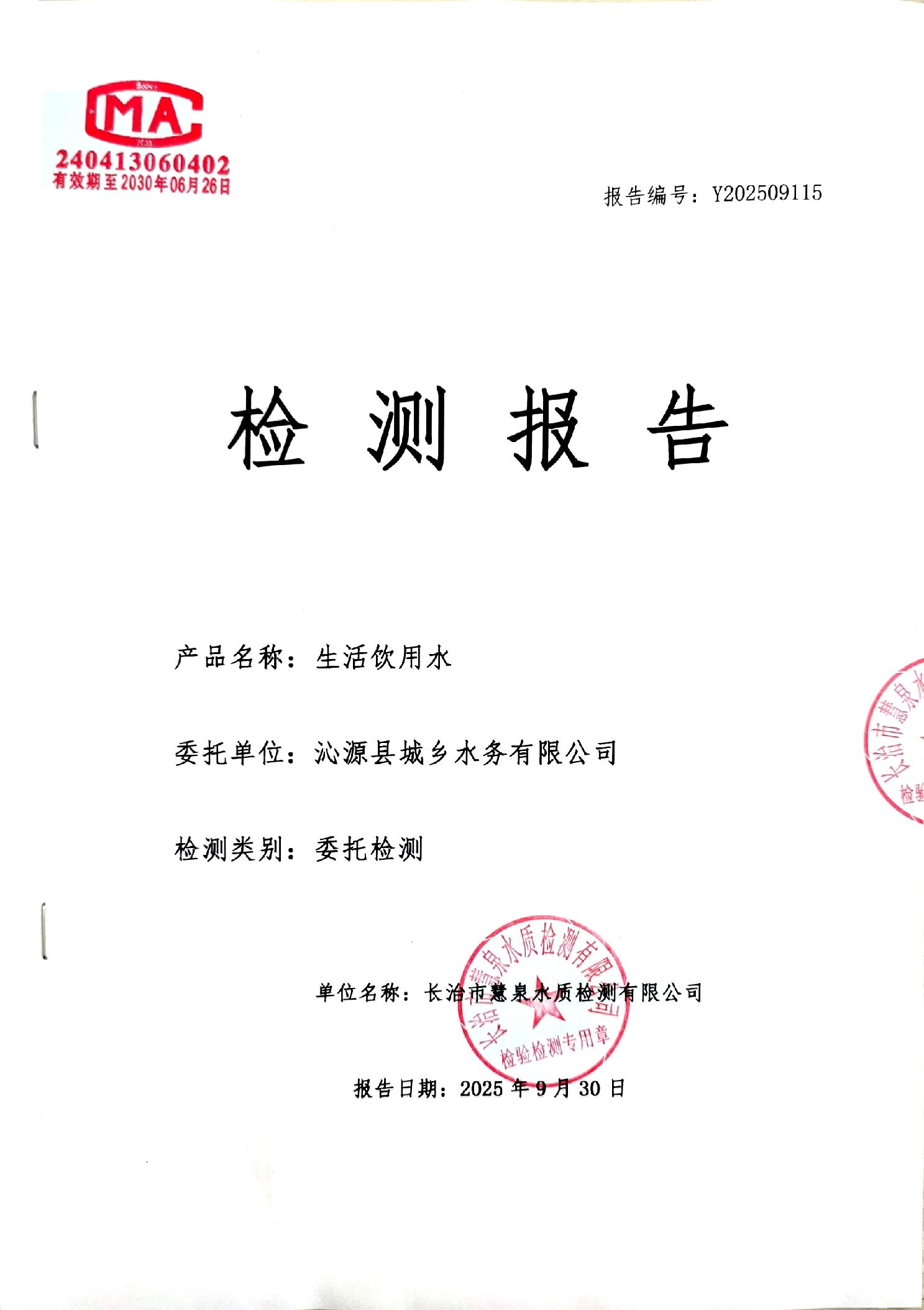 | 标题:沁源县城乡水务有限公司2025年第三季度水质检测报告 | |