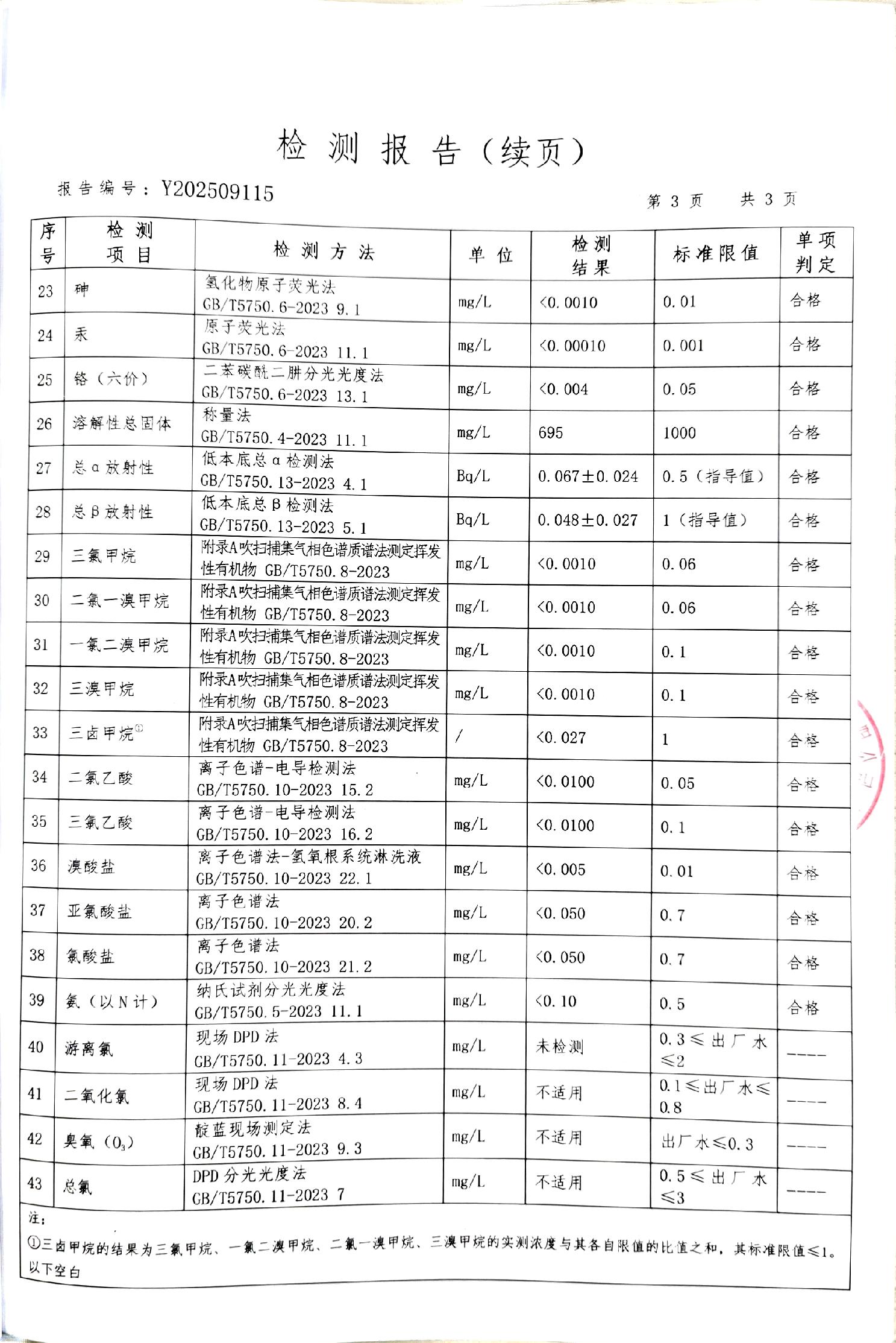 为加强沁源县城市供水水质管理,加大涉及百姓民生方面信息的公开力度,根据《中华人民共和国消费者权益保护法》《城市供水水质管理规定》《生活饮用水卫生标准》等有关法律、法规及标准,定期向公众公示沁源县城乡水务有限公司的水质情况。现将《2025年第三季度水质检测报告》面向社会公示。