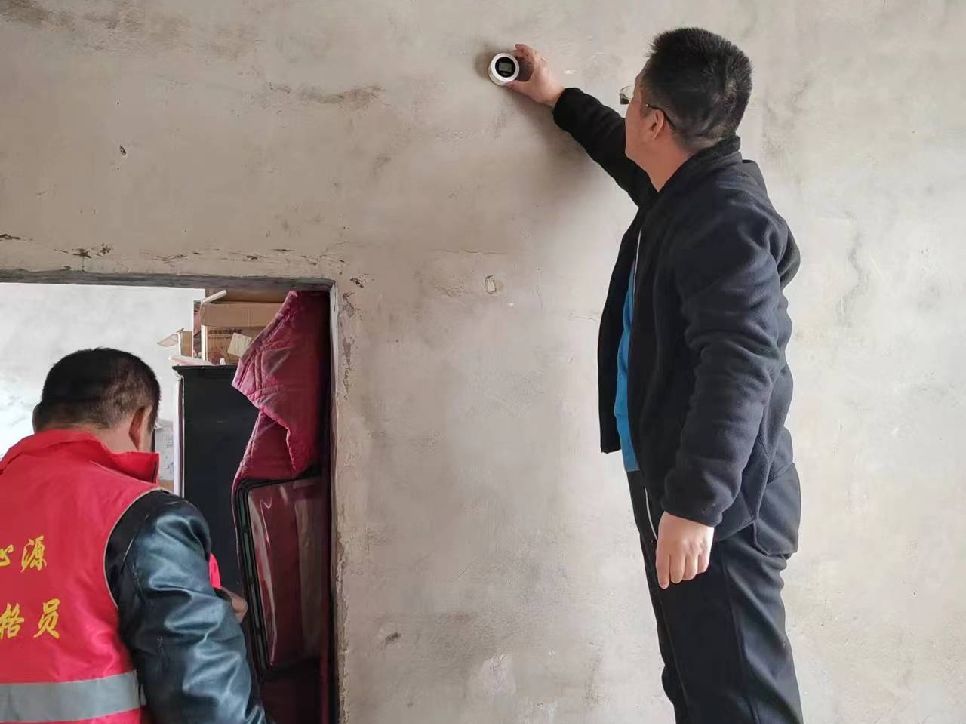 韩洪乡人大主席温宏斌查看韩洪村一氧化碳报警器使用情况。