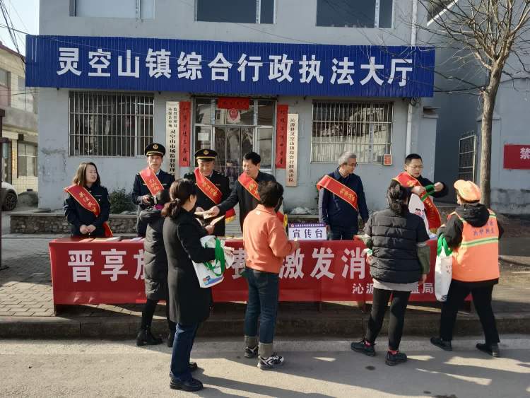 灵空山市监所开展“晋享放心消费、激发消费活力”3·15主题宣传活动。镇党委书记王向锦、纪委书记郭伟、党群服务中心主任吴晓鹏与市监所工作人员为群众讲解消费者权益相关知识并发放宣传资料。