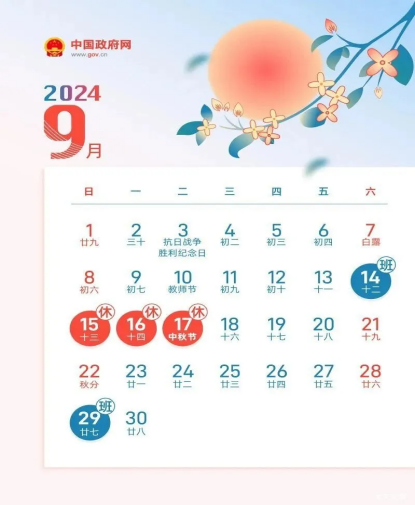 2024年9月15日(周日)-2024年9月17日(周二),共放假3天。