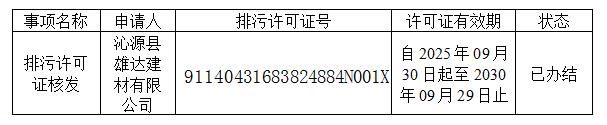 沁源县雄达建材有限公司排污许可证重新申领核发公告