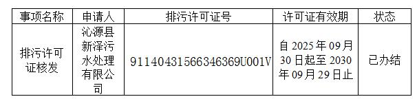 沁源县新泽污水处理有限公司排污许可证重新申领核发公告