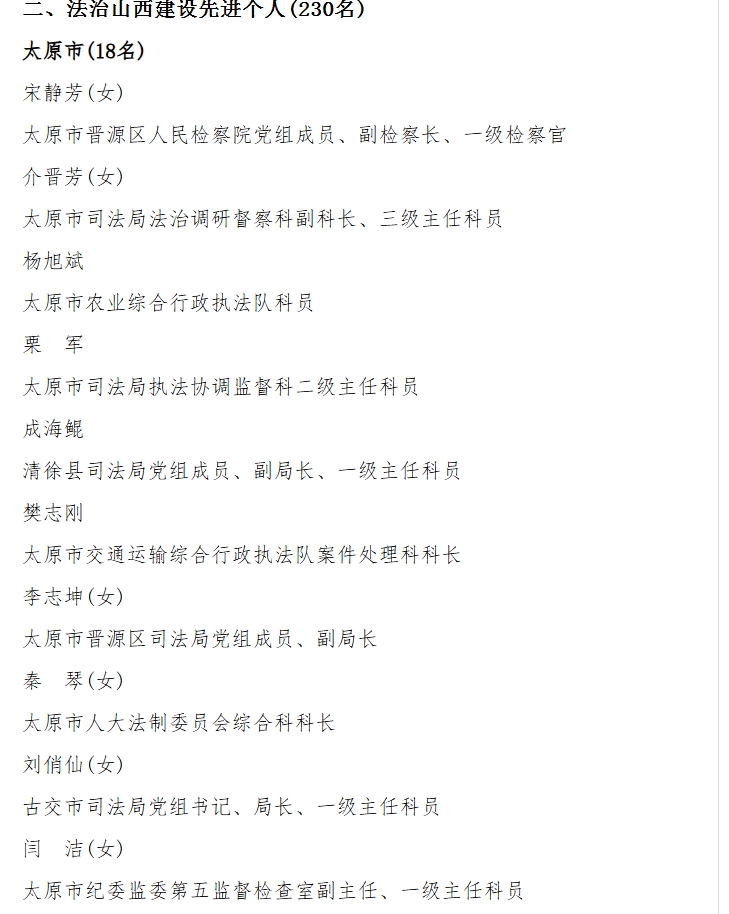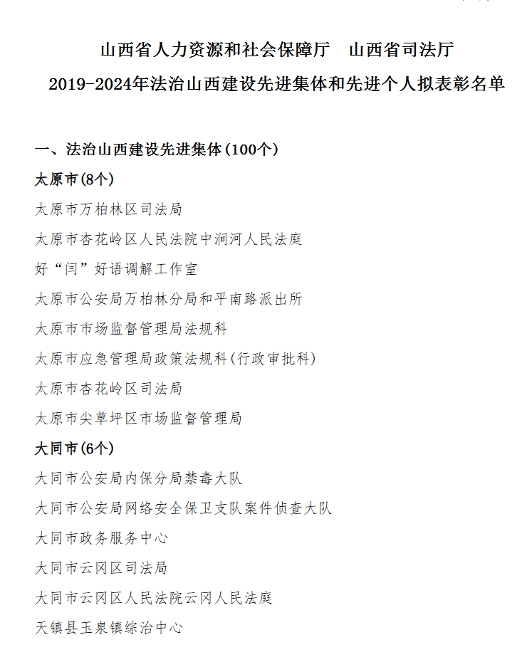 根据《关于开展法治山西建设先进集体和先进个人评选表彰的通知》(晋人社厅函〔2024〕1384号),现将法治山西建设先进集体和先进个人拟表彰对象予以公示。