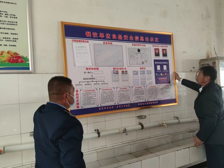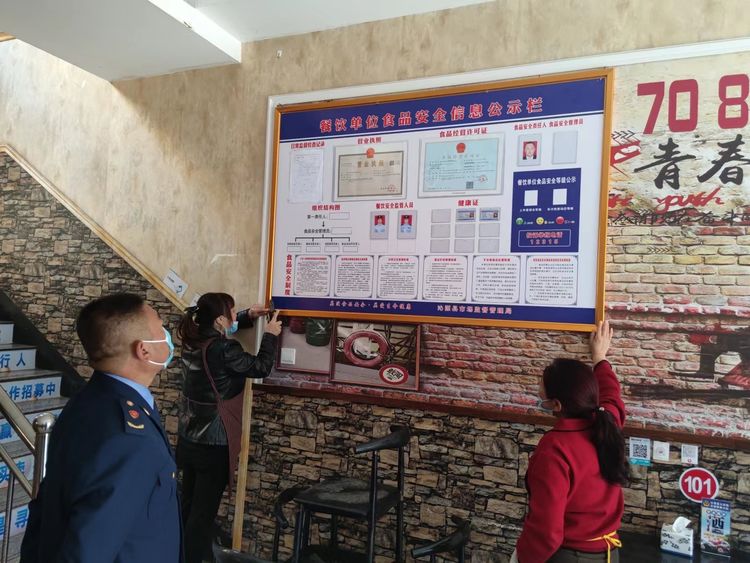 市场办现场帮助经营户悬挂食品安全信息公示栏。对紫金街乱堆乱放物品进行清理规范,并督促临街门店显示屏播放食品安全示范县内容,营造浓厚宣传氛围。
