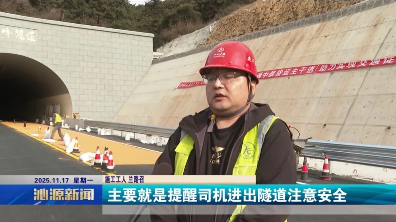 在沁源县新城县谭家岭隧道的施工现场,可以看到工作人员正在进行隧道出入口防滑路面的铺设工作,标志着该路段工程进入收尾阶段。