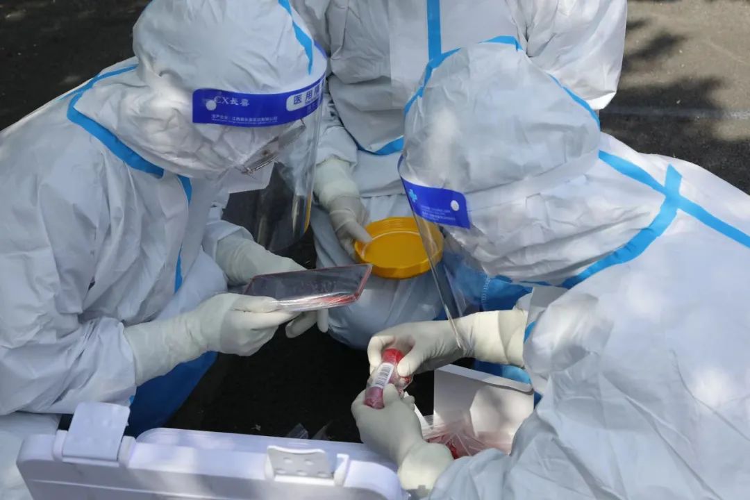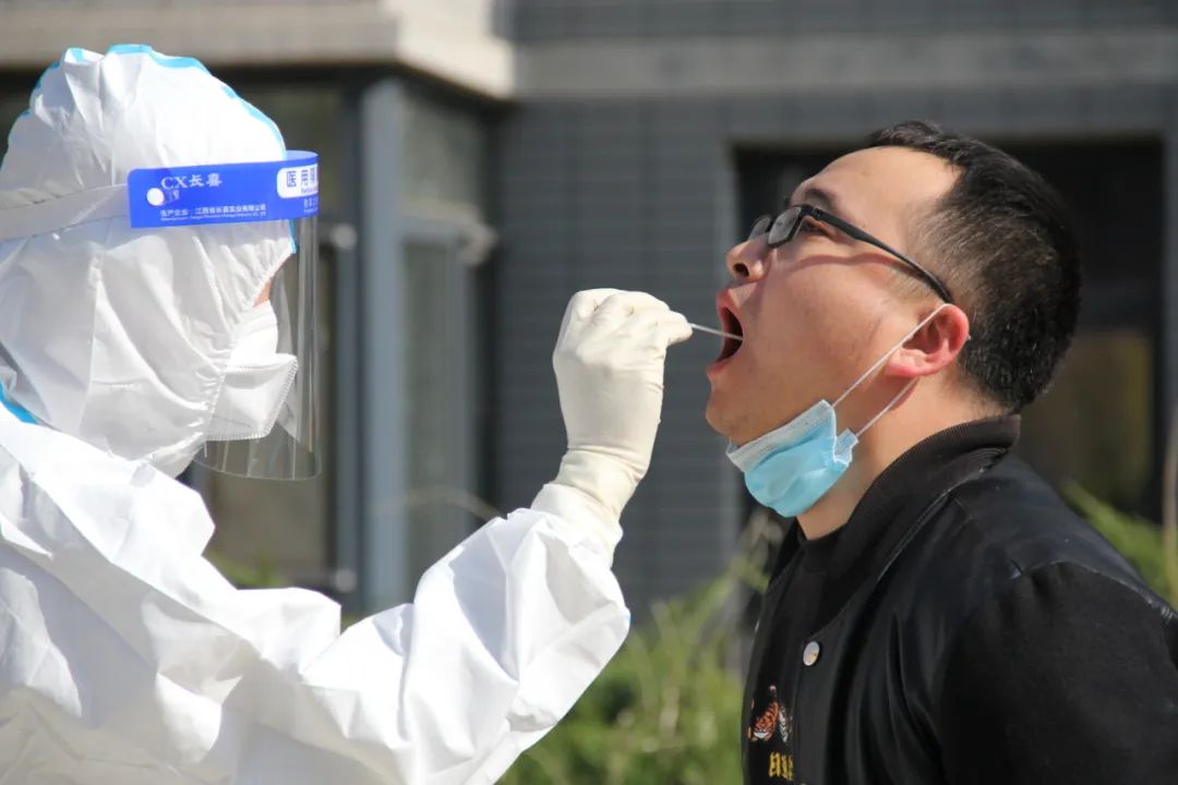“请大家佩戴好口罩,排好队,每人之间的距离保持在2米……”他们用消毒剂洗手、准备试剂管,用棉签采集咽拭子,将棉签放入试剂管中……这一套完整的动作,医护人员每天都要重复数百次……